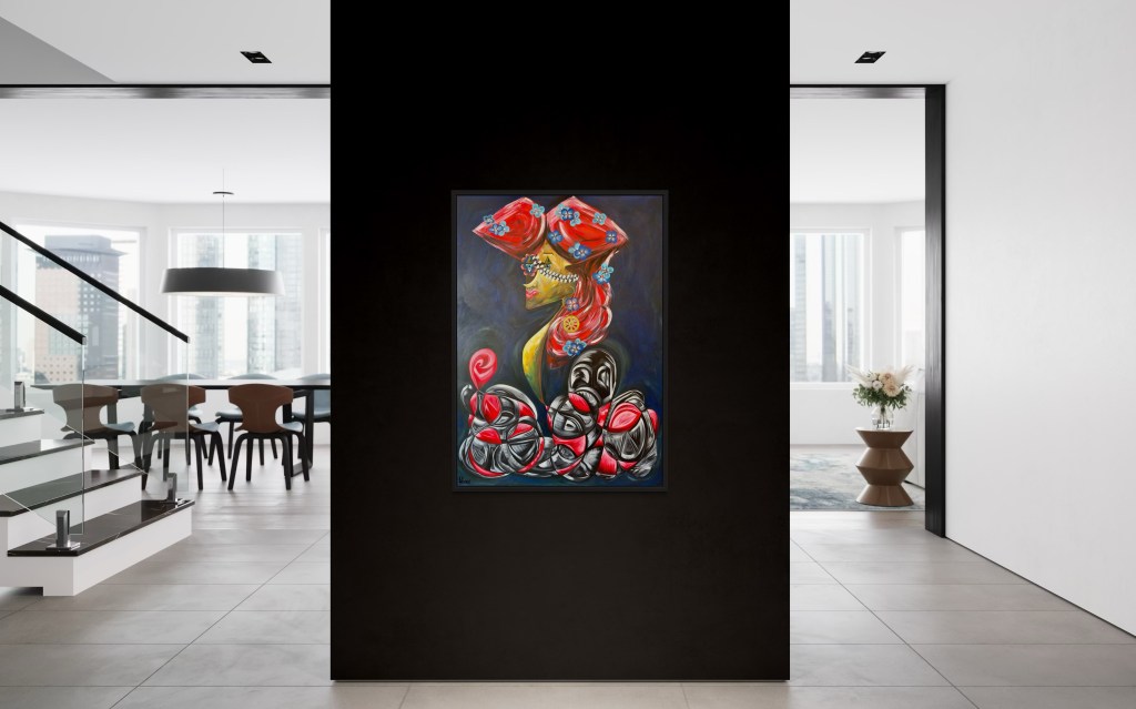 Acrylique, toile en coton sur châssis, surcouche de résine, encadrée avec une caisse américaine noire.